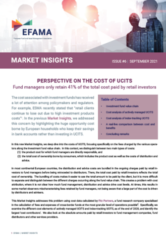 EFAMA has released its latest Market Insights report titled “Perspective on the costs of UCITS”. The full report breaks down the costs of UCITS, focusing on the fees charged for the different services provided along the investment fund value chain and distinguishing between the product cost for which fund managers are directly responsible, and the total cost of ownership borne by consumers, which includes the product cost as well as the costs of distribution and advice.