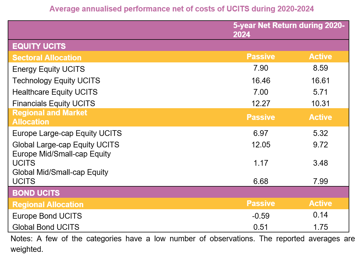 The table also shows that in some cases, active funds outperform their passive counterparts and vice versa, depending on the segment. In other words, while passive equity funds tend to outperform active funds on average across the full equity UCITS universe, this trend does not hold consistently for all sectors and allocation strategies3. This reinforces that no single fund category consistently delivers superior performance, and that strategy and sector-specific analyses are essential when selecting a fund.